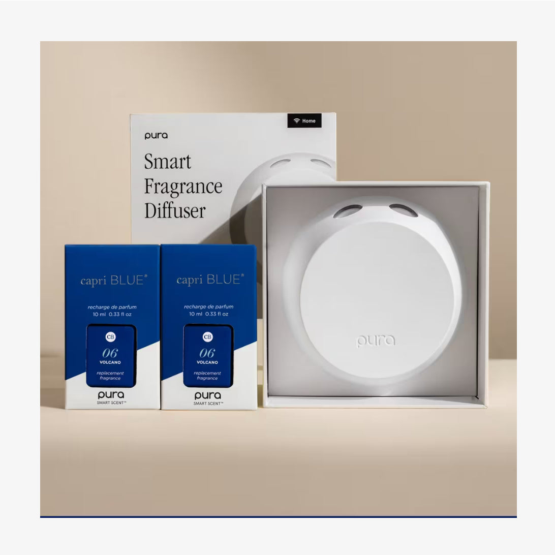 Pura 4 Home Diffuser x Capri Blue Volcano Starter Kit. Your favorite Volcano fragrance is now available for use in the Capri Blue Starter Kit! Through an innovative and user-friendly app, Pura lets you set schedules, adjust fragrance intensity, and more all from your phone. Wi-Fi required.
