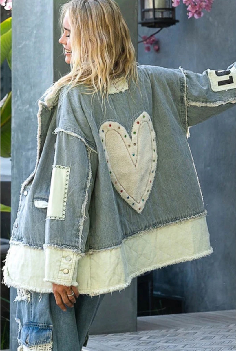 Designed in long sleeve roomy jacket top in twill with quilting detailing, color blocked twill patch, embroidery point, back heart patch, stud detailing, raw edge, out seam detailing, vintage washing, solid color.Color: DenimFabric: 100% Cotton