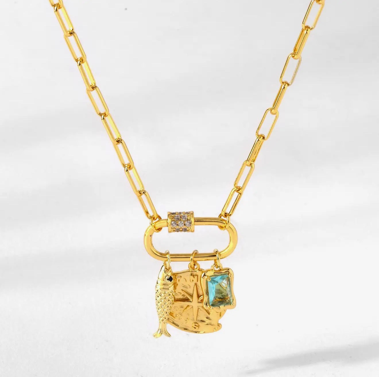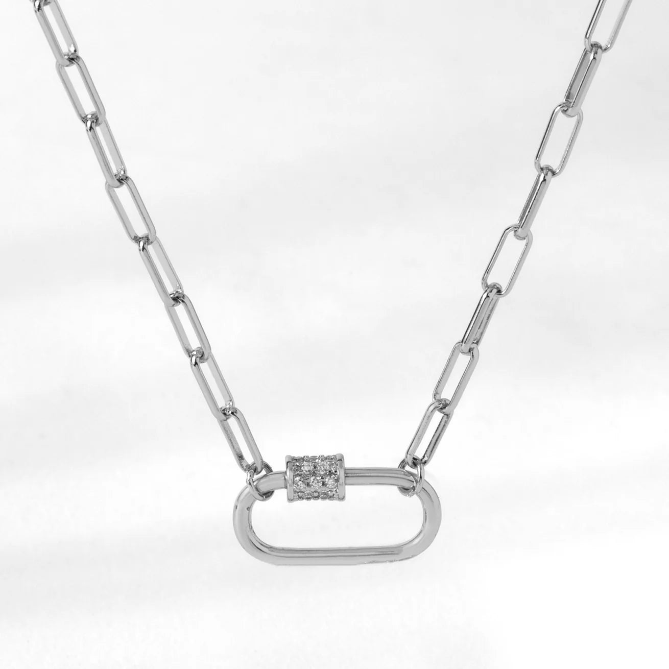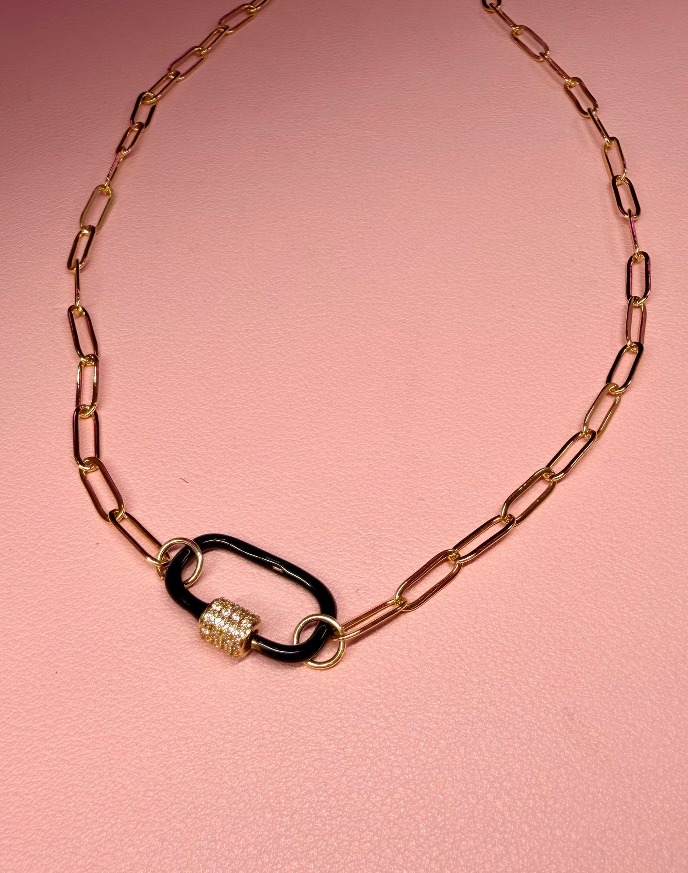 Our 18-20" gold paperclip carabiner necklace.  The gold carabiner clasp allows you to easily remove pendants, swap them for others, or wear the chain on its own!