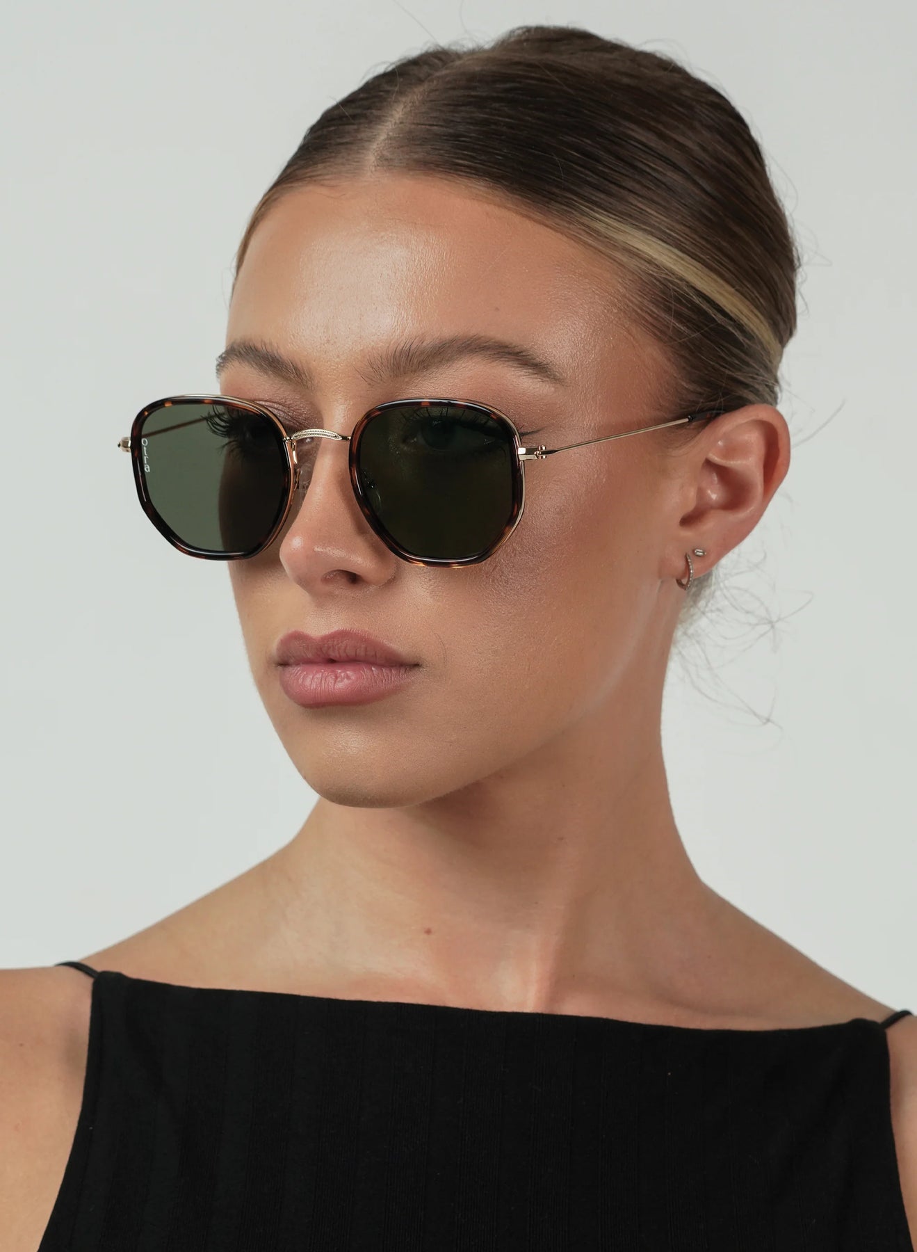 Hexagonal metal sunglasses with a tortoiseshell frame, paired with green lenses for a subtle, modern contrast.