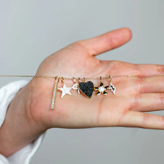 Choose your favorite chain and charms! Our bling bar charm pairs perfectly with our moody heart or your initial.