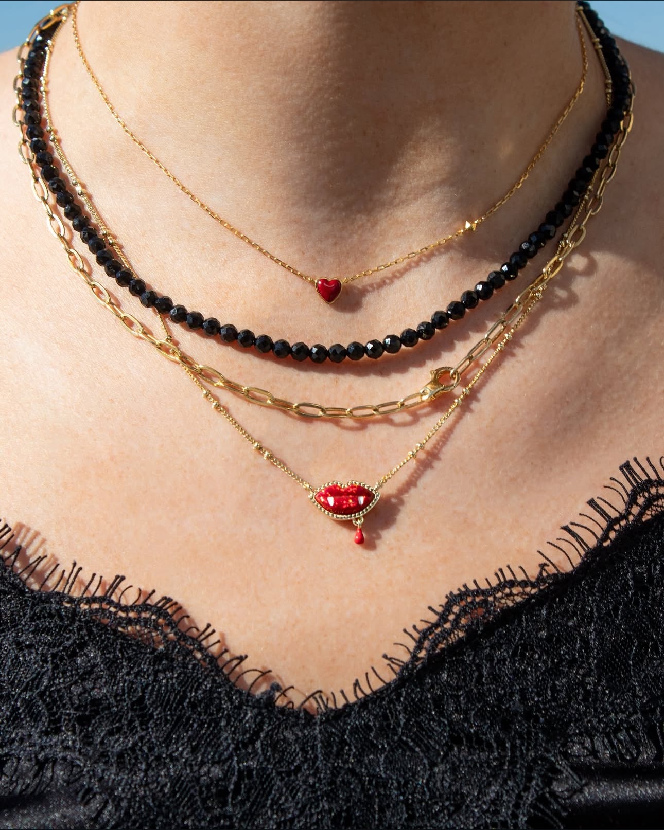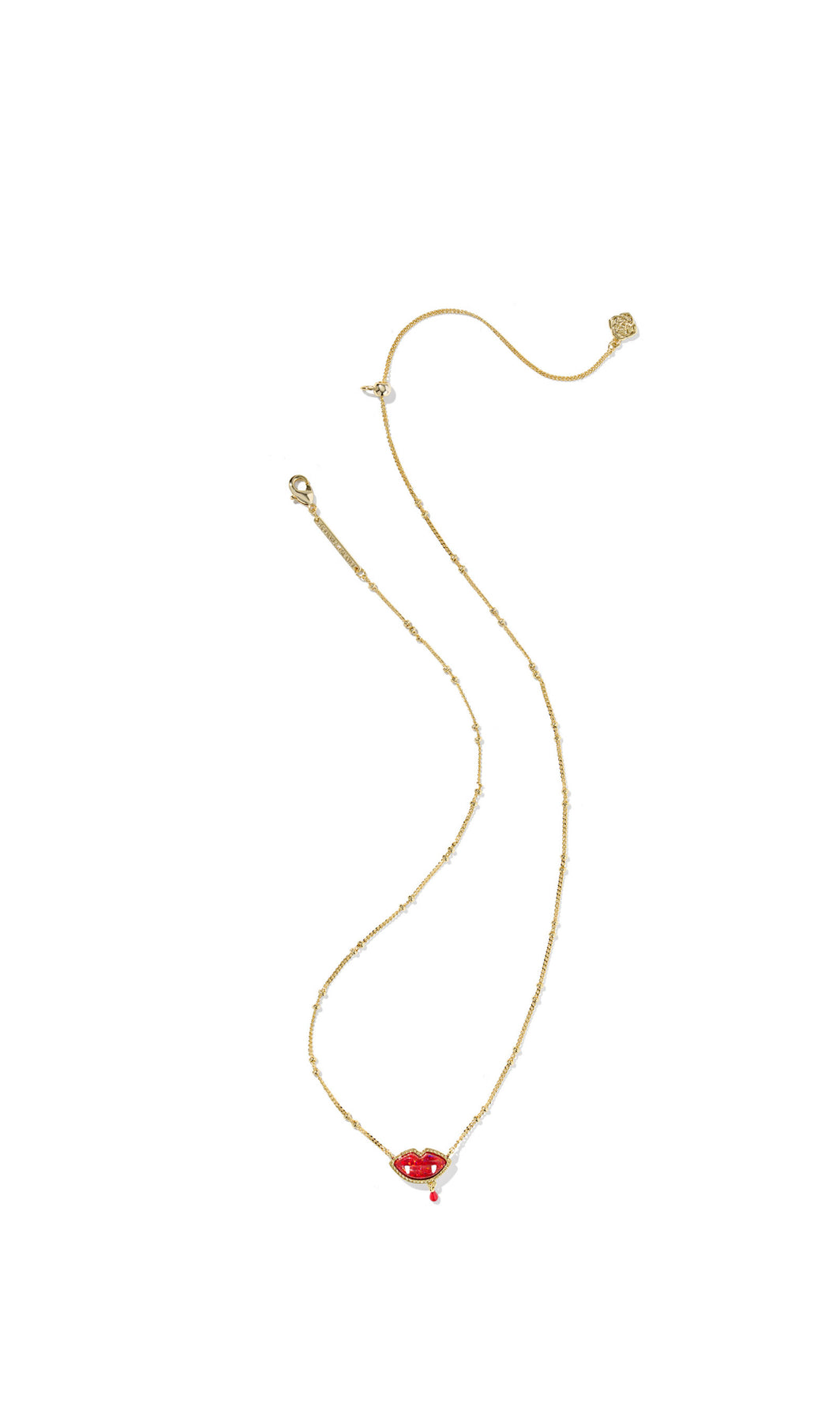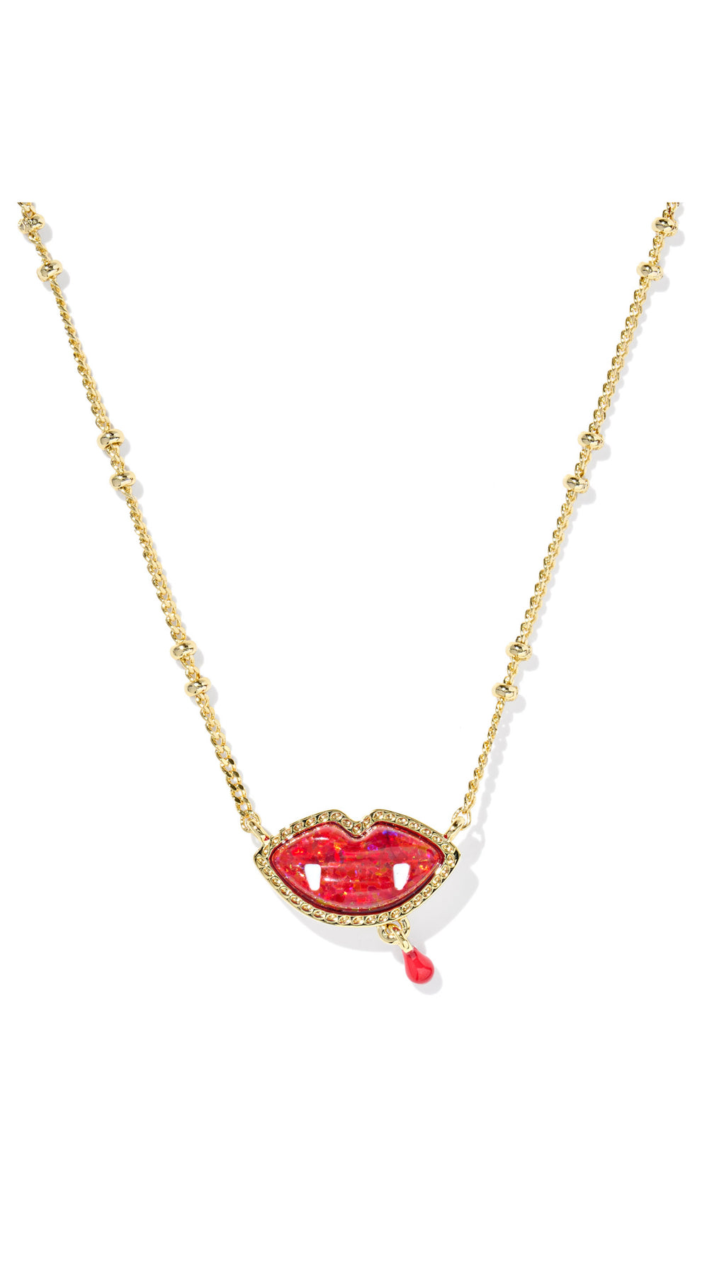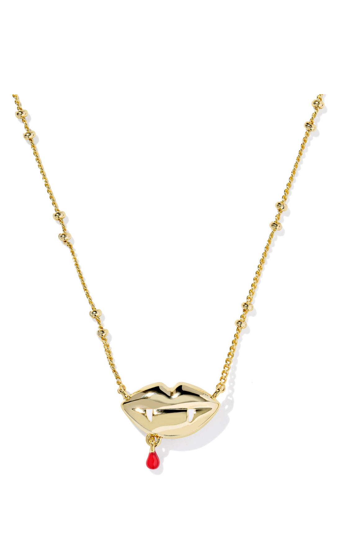 Don’t be scared, the Vampire Gold Short Pendant Necklace doesn’t bite! Featuring a cute lip shape with vampire fangs and a blood drop accent captured in vibrant enamel, this reversible necklace is a scary-good addition to any look.
