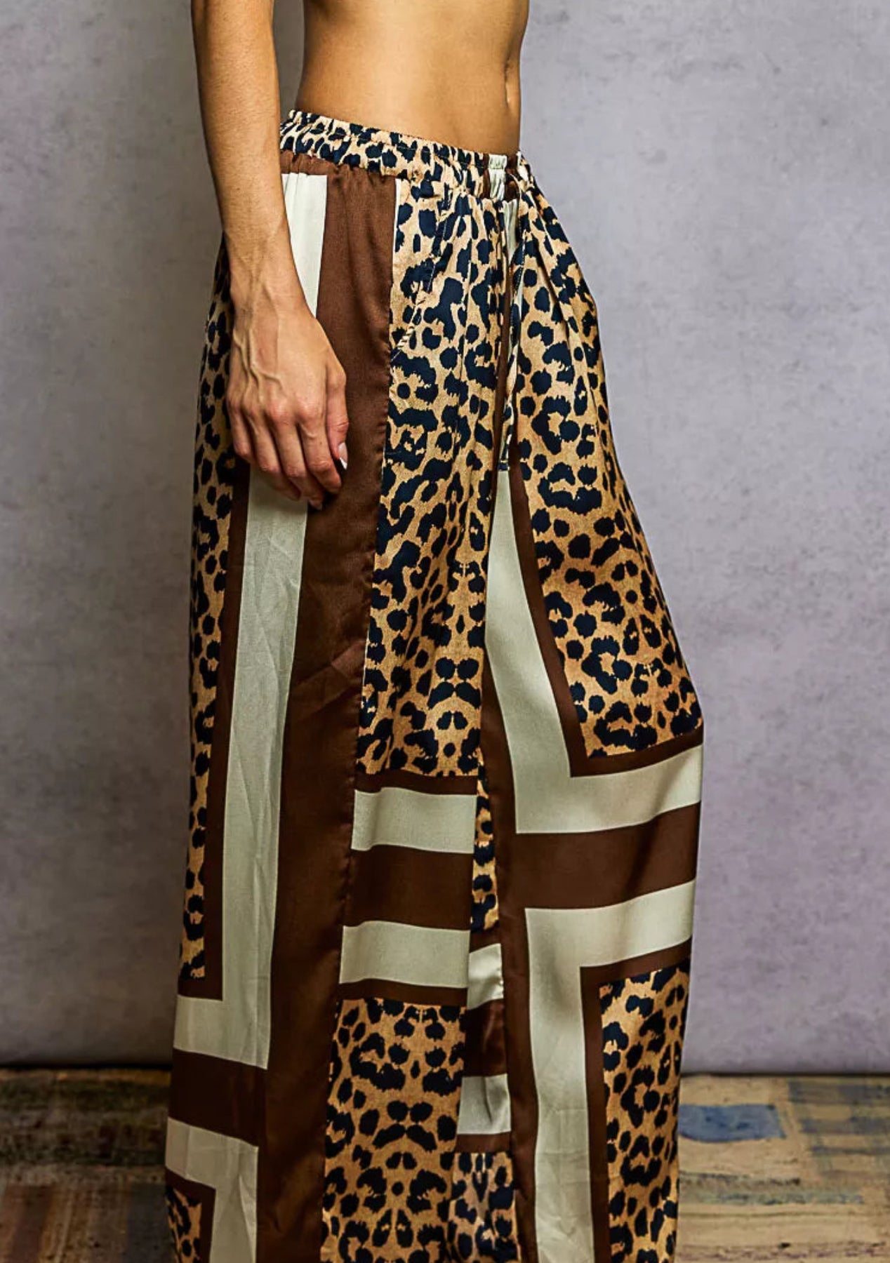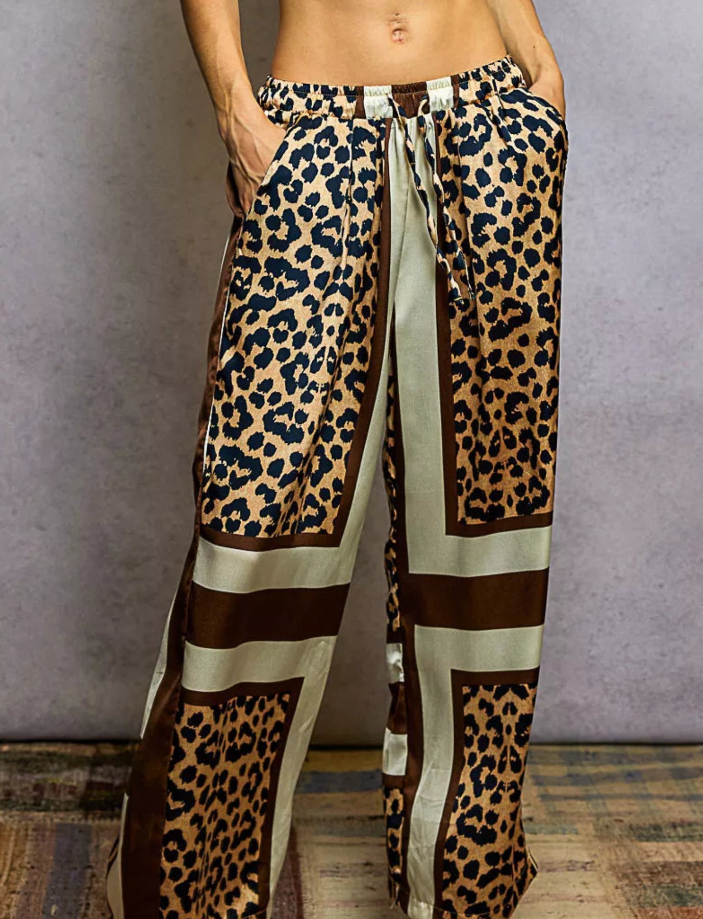 The Leopard Printed Woven Wide Leg Drawstring Pants are a bold and statement-making addition to your wardrobe. With a fierce leopard print design, these pants exude confidence and style. The wide leg silhouette offers a comfortable and flowy fit that is perfect for both casual and dressy occasions. The drawstring waist allows you to adjust the fit to your preference for all-day wear. Pair these pants with a solid-colored top and heels for a chic and eye-catching look that will turn heads wherever you go. Embrace your wild side with the Leopard Printed Woven Wide Leg Drawstring Pants!