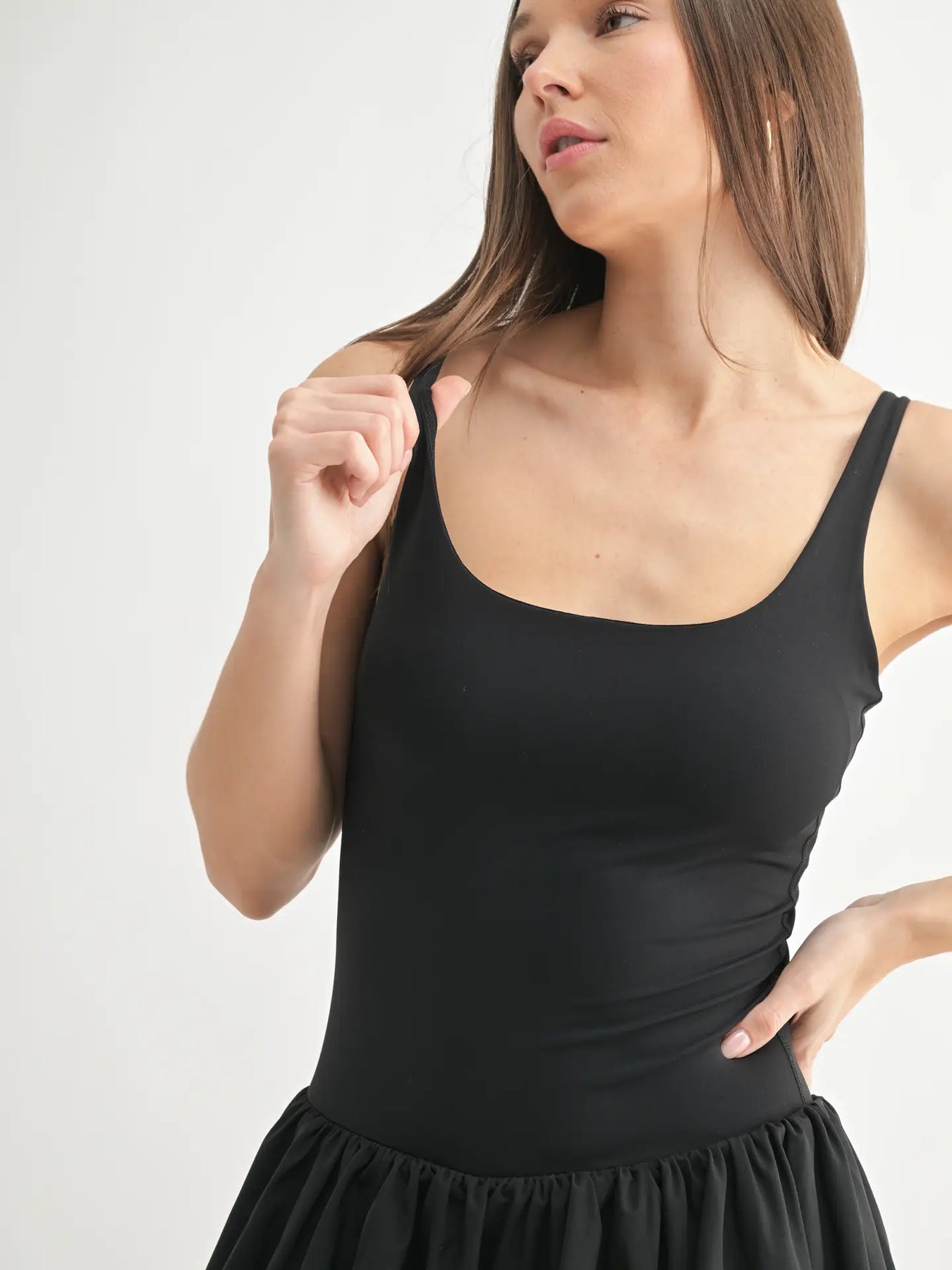 A flirty twist on function, the Luna Bubble Active Mini Dress merges sporty and chic with a silhouette that’s anything but ordinary. Featuring a fitted tank-style bodice with a scoop neckline, it flows into a voluminous bubble-hem skirt for playful movement with every step. Designed in a moisture-wicking, ultra-stretch fabric, this dress is perfect for tennis, errands, or brunch with the girls. Hidden shorts underneath add confidence and comfort so you can move freely—wherever the day takes you.