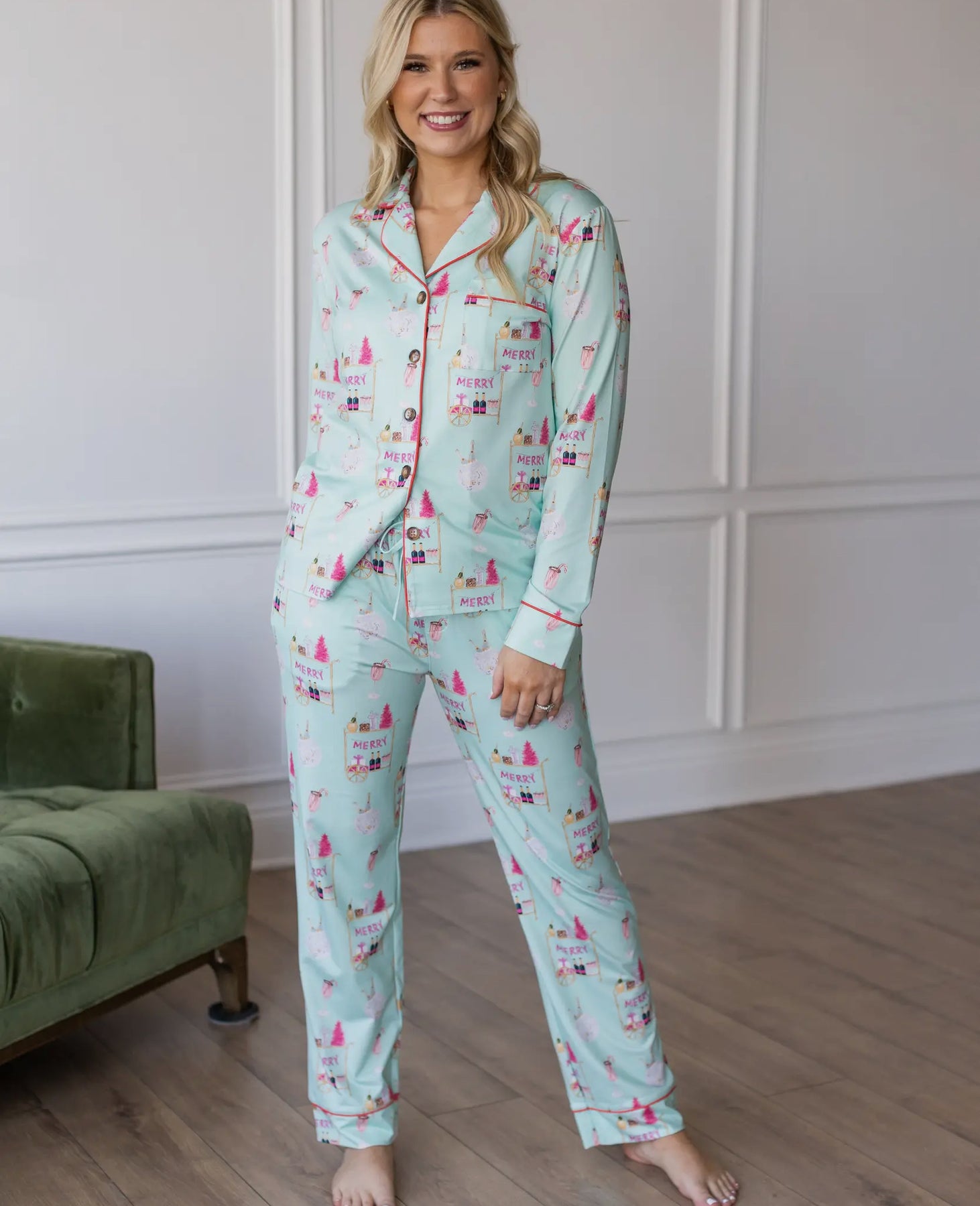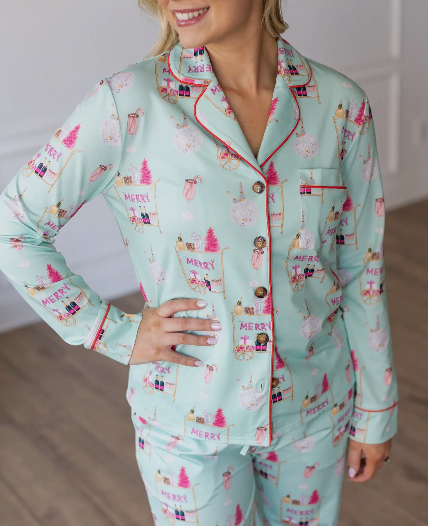This set features a button-front shirt adorned with piping trim and a matching elastic-band short with pockets and button detail on the front.