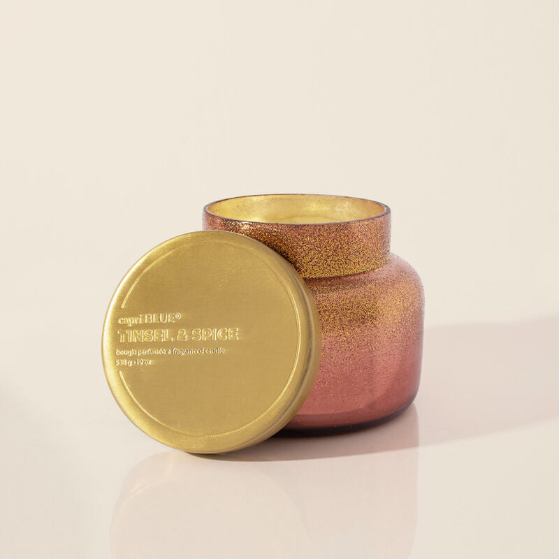 Looking for your new holiday staple!? Welcome to the Tinsel & Spice Glitz Signature Jar! It features our iconic Signature jar shape in a bronzed berry finish with notes of juniper berry, cinnamon and a twist of orange mandarin, vanilla and forest woods. It embodies the spirit of the holidays in fragrance and in style!